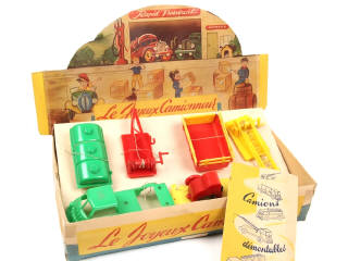 dimensions du coffret : 35 x 21cm - longueur : 14,5 cm - permet la réalisation de différents modèles - camion en plastique à construire - contient : une carrosserie, un châssis (moteur à clef fonctionne), une citerne, un plateau avec grue, un plateau à ridelles, un plateau avec échelle & une notice de montage - avec socle de présentation