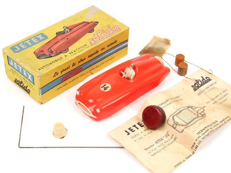 longueur : 15 cm - propulsion du modèle par fusée - avec quelques accessoires & notice - pneus séchés - boîte & notice plus ou moins tachées