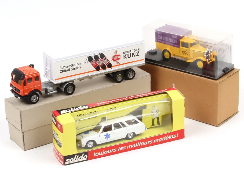 comprend : MERCEDES semi-remorque fourgon 'BILTA' (promotionnel), PEUGEOT 504 ambulance & CITROËN C4 fourgon 'L'EST REPUBLICAIN' (réalisé pour les 100 ans du journal)