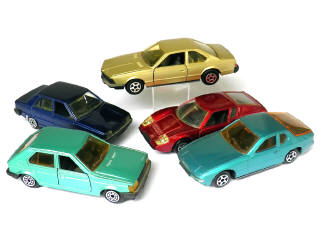 miniatures reproduisant les modèles : LIGIER JS2, PORSCHE 924, BMW coupé, TALBOT HORIZON & RENAULT 9