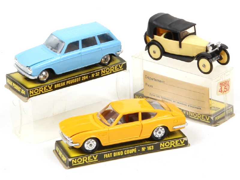 comprend : PEUGEOT 172R (avec bulletin d'inscription au club), 204 break & FIAT DINO coupé - carrosseries très légèrement déformées par endroits - quelques petits accrocs sur les boîtes