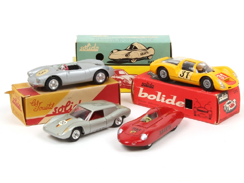 comprend : PORSCHE SPYDER (état 'D', détails de peinture ajoutés, manque pilote), CARRERA (manque essuie-glaces & un rétroviseur), GT LE MANS & FIAT ABARTH - 2 boîtes en état 'c'