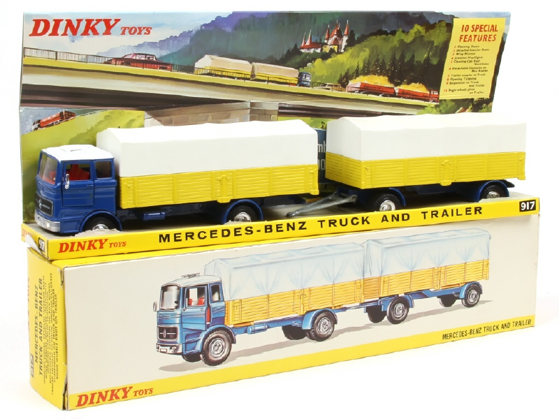 DINKY TOYS (GB) 917 MERCEDES Bâché avec remorque bâchée bleu foncé & jaune, bâches blanches