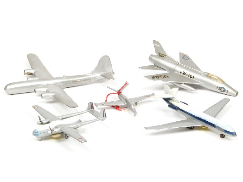 états de 'B' à 'C' - comprend : CARAVELLE SE 210, BOEING B-50 SUPERFORTRESS (avec manques & parties cassées), SUPER SABRE F 100, FOUGA SM 170 R & NORATLAS - on y retrouve les marques : MERCURY, TEKNO & C.I.J (3 exemplaires) - petits manques sur certains décalques