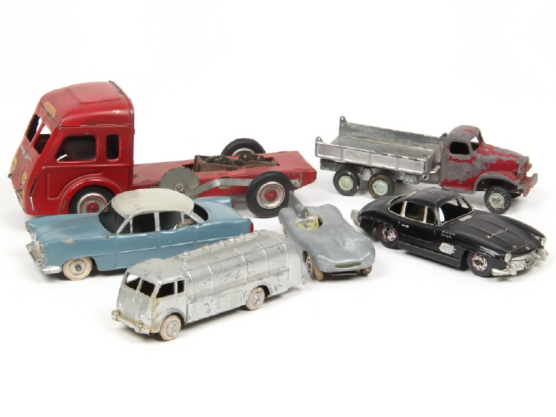 états de 'D' à 'F' - comprend : SIMCA VEDETTE, MERCEDES 300 SL, RENAULT citerne, benne, DODGE & JAGUAR - on y retrouve les marques : FRANCE JOUETS, QUIRALU, ERIA & C.I.J - avec manques, parties repeintes & traces d'oxydation