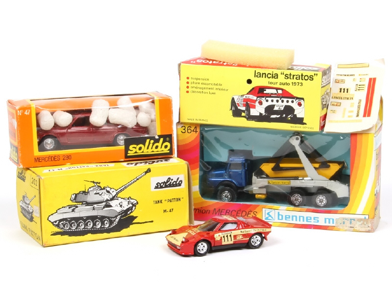 comprend : MERCEDES 280, LANCIA STRATOS, tank PATTON & MERCEDES multi-benne - 2 boites en état 'c' - avec cales de boites
