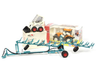 états de 'A' à 'C' - comprend : tracteur RENAULT de la marque JOAL, chargeuse sur roues de marque GESCHA (toit à refixer) & charrue sur roues à 24 socs - 2 modèles en boites (état 'c')