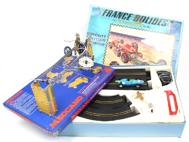 comprend : coffret 'FRANCE BOLIDE' slot-car FRANCE JOUET (état 'C.c', non testé & incomplet) & boite MECCANO n°4 en partie montée (état 'B.b, avec manques)