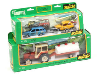 contient : RENAULT 12 Break 'ELF' & RENAULT 5 ALPINE 'ELF' sur sa remorque - boîte légèrement déformée - on y joint un coffret agricole de la référence 514 (boîte état 'b')