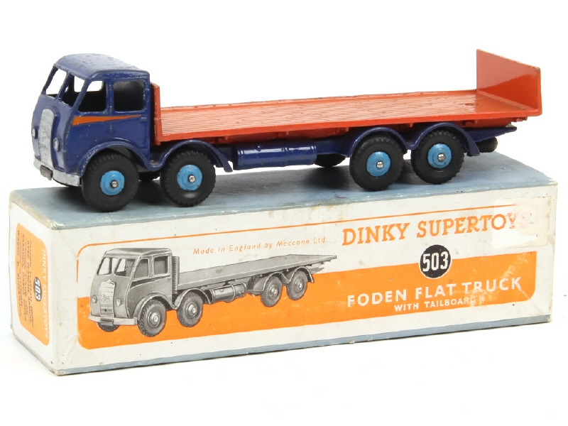 DINKY TOYS (GB) 503 FODEN Plateau à dosseret outremer & orange, jantes bleu vif