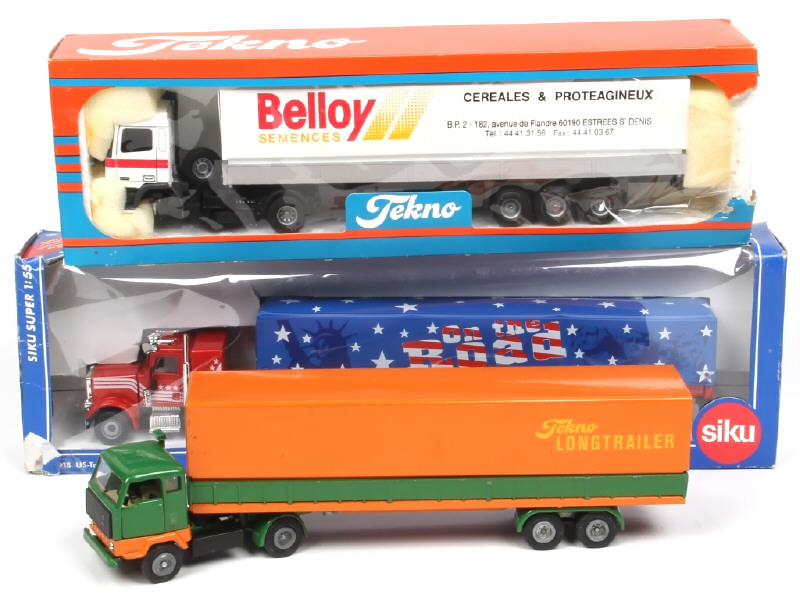 on y retrouve les publicité : 'ON THE ROAD AGAIN, BELLOY SEMENCE & TEKNO LONG TRAILER' (modèle en état 'B', micro éclats par endroits sur la remorque) - comprend les marques SIKU & TEKNO