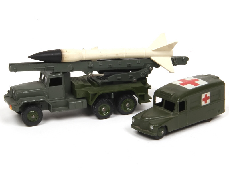 comprend : DAIMLER ambulance militaire (un pneu coupé) & HONEST JOHN MISSILE LAUNCHER (jantes fondues, mécanisme à revoir, manque décalque de missile)