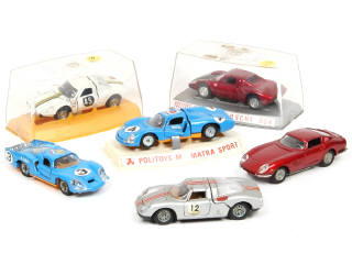 comprend : PORSCHE 904 GTS (2 exemplaires dont un avec capot-moteur repeint), MATRA sport, FERRARI 275 GTB, 'Le Mans' PININFARINA & ALPINE RENAULT - quelques carrosseries plus ou moins encrassés - 2 exemplaires en boite (une coque légèrement fondue)