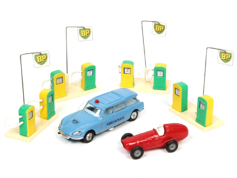 états de 'B' à 'C' - comprend : CITROEN DS 'ORTF' break (avec une partie fondue sur une aile arrière & une vitre fêlée), voiture de courses à friction (fonctionne - manque saute-vent) & postes à essence 'BP' (en boite revendeur de 12 - état 'b') - on y retrouve notamment les marques : TRIANG, MINIALUXE & INJECTAPLATIC
