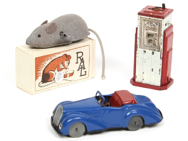 états de 'B' à 'D' - comprend : cabriolet (de marque tchécoslovaque - moteur à clef à revoir - avec clef), pompe à essence 'ESSO' & souris (moteur à clef fonctionne - boite en état 'b' - légèrement tachée)