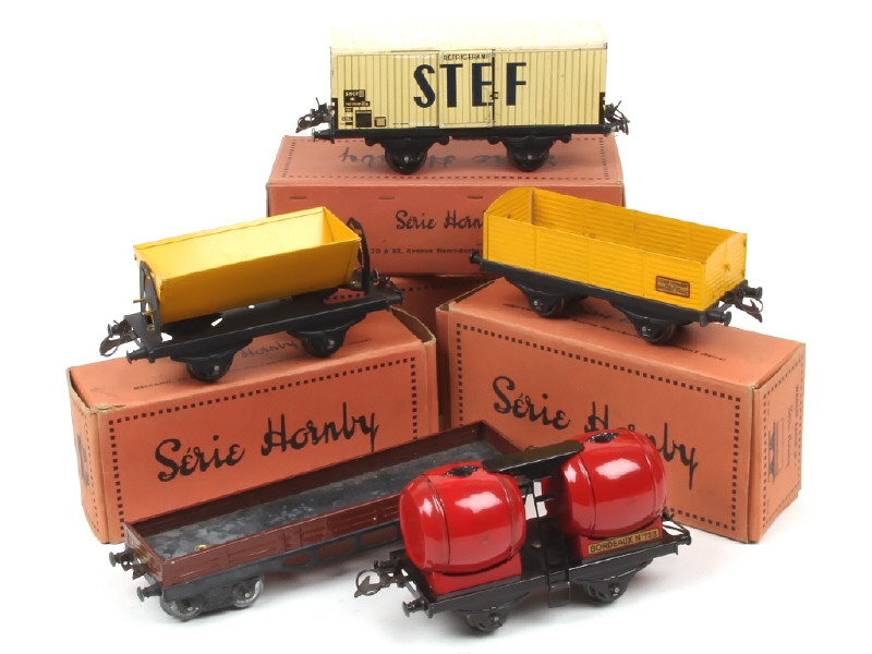 états de 'A' à 'C' - comprend : wagon frigorifique 'STEF', double-foudre, tombereau, benne basculante, plateau à ridelles basses & tombereau avec vigie (non présenté sur la photo) - avec traces d'humidité & manques sur certains exemplaires - les boîtes sont en état de 'c' à 'd'