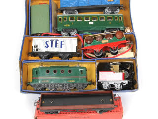 états de 'B' à 'D' - comprend fond de coffret avec motrice éléctrique BB 8051 (non testé), voiture voyageurs, 4 wagons marchandises, transformateur & broches d'assemblage - on y joint une reproduction de tender HACHETTE - avec légères traces d'oxydation & petits manques possibles