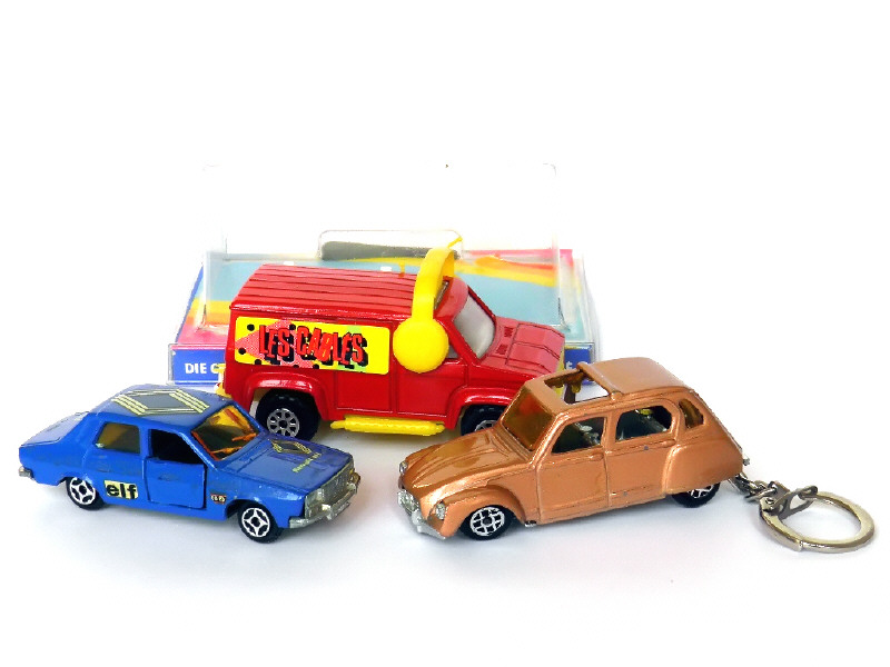 états de 'A' à 'B' - miniatures reproduisant les modèles CITROËN DYANE en porte-clefs (suspension avant défectueuse), RENAULT 12 (petits manques sur les décalques) & fourgon US 'LES CABLES' (avec boîte état 'b')