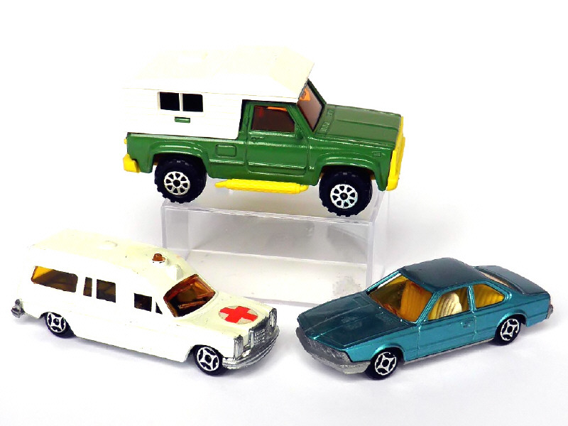 miniatures reproduisant les modèles : BMW 633 coupé, MERCEDES ambulance & pick-up US camping-car