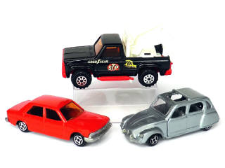 miniatures reproduisant les modèles : CITROËN DYANE, PEUGEOT 305 SR & pick-up US dépannage