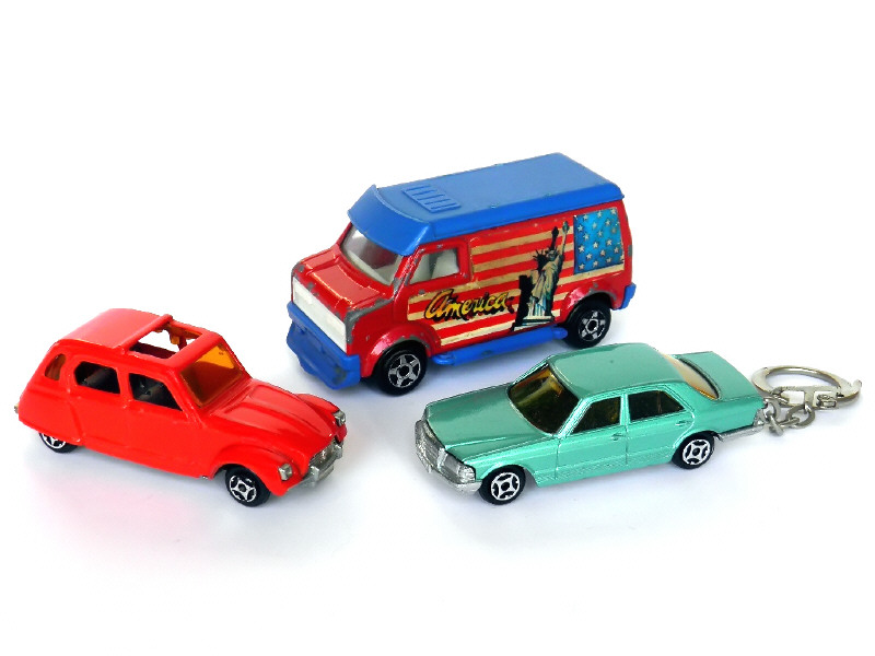 miniatures reproduisant les modèles : CITROËN DYANE, MERCEDES 280 SE en porte-clefs & fourgon US 'AMERICA' (état 'E')