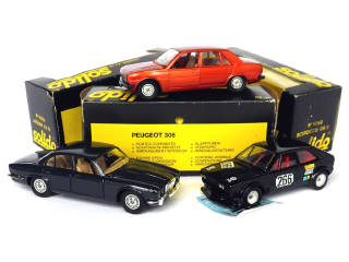 miniatures reproduisant les modèles : JAGUAR XJ12, VOLKSWAGEN SCIROCCO (avec planche de décalques) & PEUGEOT 305