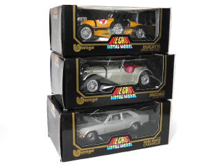 échelle 1/18ème - miniatures reproduisant les modèles : BUGATTI Grand Prix 1935, JAGUAR SS 100 1937 & ROLLS ROYCE CAMARGUE (échelle 1/22ème, petits manques)
