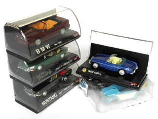miniatures reproduisant les modèles : VOLKSWAGEN COCCINELLE cabriolet, FORD MUSTANG, JAGUAR E, BMW cabriolet & MGB roadster - un modèle en kit