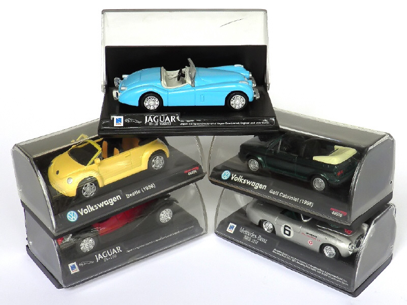 miniatures reproduisant les modèles : JAGUAR XK120, JAGUAR SS, MERCEDES, VOLKSWAGEN NEW BEETLE & VOLKSWAGEN GOLF cabriolet - une boîte état 'c'