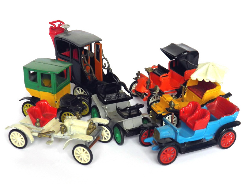 miniatures reproduisant les modèles : PEUGEOT, DEDION BOUTON, ROCHET SCHNEIDER, HAUTIER, SIZAIRE & NAUDIN & GOBRON BRILLIE