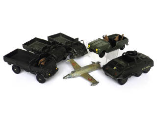 états de 'F' à 'R' - miniatures reproduisant les modèles : RENAULT SINPAR 4x4, MERCEDES UNIMOG (3 exemplaires), combat car M20 & avion LEDUC - on y retrouve les marques : DINKY TOYS FRANCE & SOLIDO