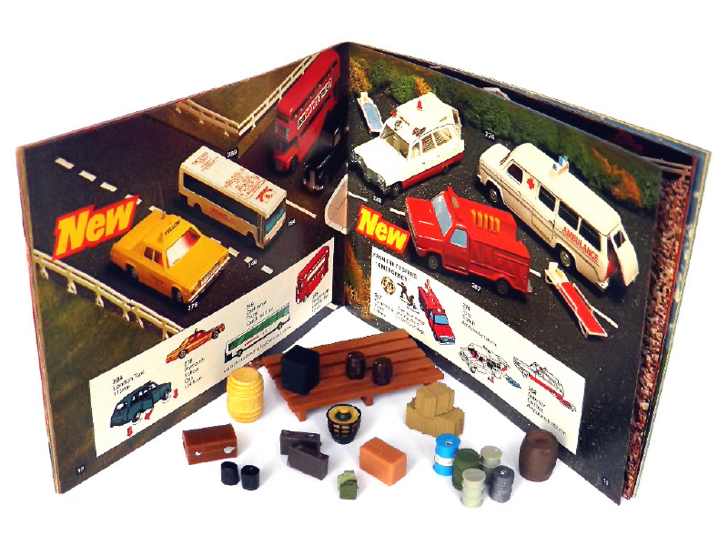 comprend : une malle, 2 valises, 4 tonneaux, 5 fûts, 3 caisses, un bidon, 2 jerrycans, 2 sacs, une bonbonne de vin & une palette - on y joint un catalogue DINKY TOYS GB 1978 (état 'a')