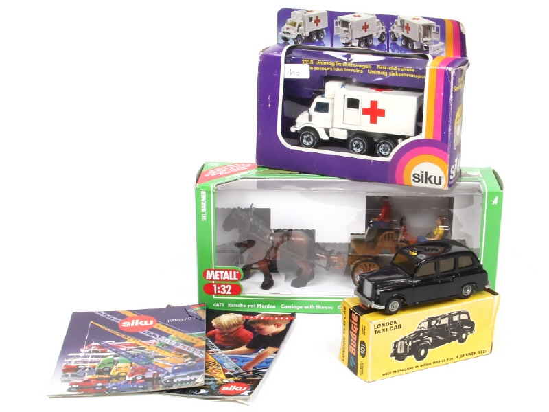 différentes échelles - états de 'A' à 'B' - comprend : voiture hyppomobile, UNIMOG ambulance & LONDON TAXI CAB (manque l'autocollant de plaque d'immatriculation avant) - on y retrouve les marques : SIKU & BUDGIE - les boites sont en état de 'b' & 'c' - on y joint 2 catalogues de la marque SIKU des années 1996/97 & 98/99