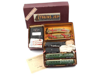non testé - dimensions du coffret : 41 x 22 cm - contient : une locomotive à vapeur type 232 avec tender, une voiture de voyageurs, mixte, un transformateur, 12 rails courbes, 8 rails droits, notice, fiche de garantie & bon de contrôle - on y joint un transformateur de la marque 'JIR'