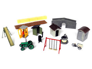 réalisations en plastique - comprend : tracteur, triporteur 'glace', pont, balançoire, puits, cabine téléphonique, toboggan, etc