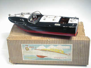 le bateau est fabriqué en bois avec de nombreux détails en métal - longueur 39 cm - le canot a été baptisé I.M.P. ERIAL (jeu de mot avec la marque du jouet) - avec moteur électrique pour la propulsion du bateau & l'éclairage du phare avant - alimentation à revoir - TRES BEAU JOUET !