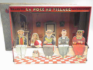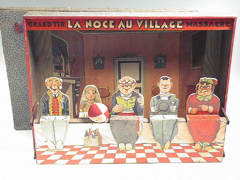 ce jeu de massacre de début de siècle est fabriqué en bois et carton - la balle d'origine est fourrée en crin - les couleurs sont très bien conservées pour un jeu de cette époque ! l'illustration bien que non signée, fait penser à Benjamin RABIER - PIECE MAGNIFIQUE !
