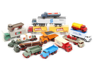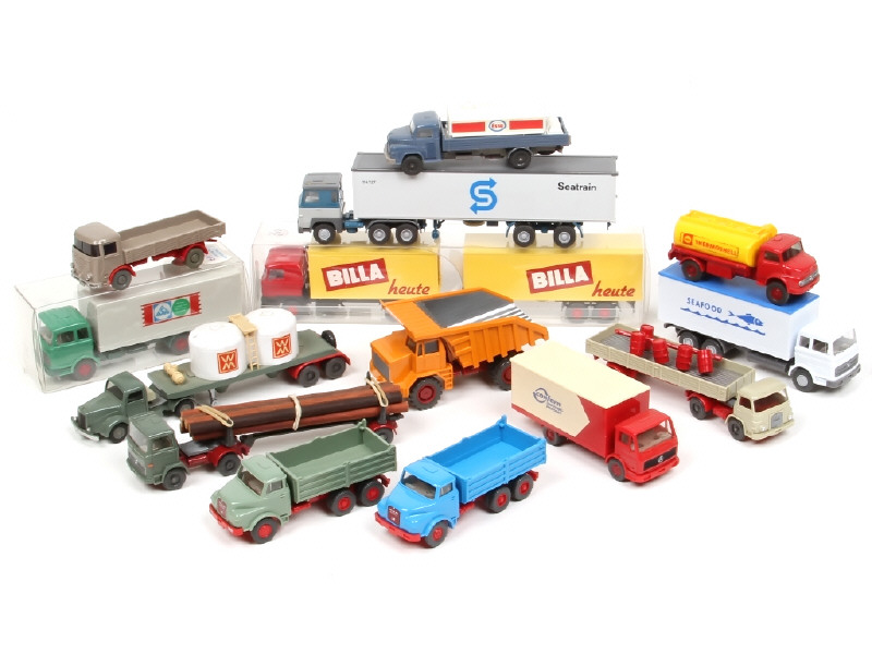 miniatures reproduisant notamment les modèles : KAELBLE, MERCEDES, SCANIA, MAN, BÜSSING (état 'c' avec parties cassées & manquantes) - 2 exemplaires en boite (état 'b') - possibilité de petits manques - carrosseries plus ou moins encrassées