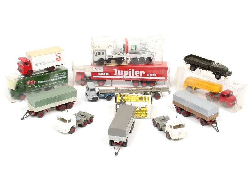 miniatures reproduisant les modèles : MERCEDES, MAN & SAURER - 4 exemplaires en boite (état 'b') - on y retrouve les marques : WIKING, HAG & KIBRI - on y joint un CATERPILLAR CAT D4D de la marque NZG - petits accessoires manquants - carrosseries plus ou moins encrassées