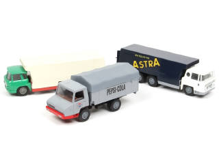 états de 'A-' à 'C' - comprend : BERLIET STRADAIR benne bâchée 'PEPSI-COLA', BERNARD fourgon 'ASTRA' & WILLEME fourgon (carrosserie légèrement encrassée avec petits éléments non conformes) - on y retrouve les marques VEREM & SOLIDO
