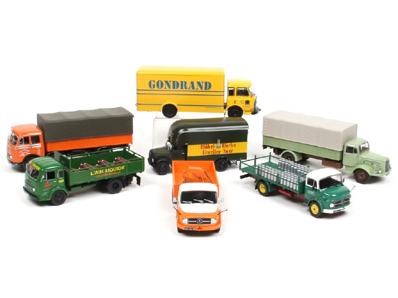 comprend : MERCEDES LP 333, L 911 (2 exemplaires différents), L 325, SOMUA JL 19, OPEL BLITZ & SIMCA CARGO - quelques petits accessoires manquants
