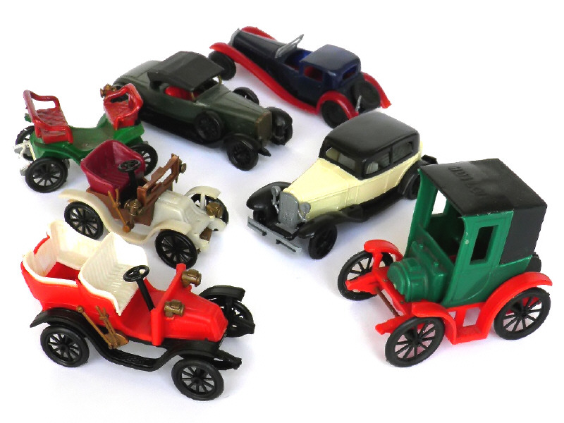 états de 'A' à 'F' - miniatures reproduisant les modèles : GEORGES RICHARD, ALFA ROMEO, PACKARD, BUGATTI, RENAULT, ISOTTA FRASCHINI, PEUGEOT, DEDION BOUTON, PANHARD LEVASSOR & JEEP - on y retrouve les marques : CLE & INJECTAPLASTIC - majoritairement avec gravure HUILOR - on y joint quelques pièces détachées
