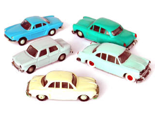 échelle 1/86ème - miniatures reproduisant les modèles : RENAULT DAUPHINE, RENAULT FLORIDE, SIMCA ARIANE, SIMCA VERSAILLES & SIMCA 1000 - 4 modèles avec lest - petits manques sur les chromes