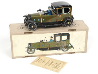 longueur 25,5 cm - moteur à clé (fonctionne) - avec direction - fabrication contemporaine d'un modèle des années 20 - avec certificats d'édition limitée numérotés 1150/5000 exemplaires - quelques très légères traces d'oxydation par endroits