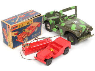 comprend : GEE.I.JEEP de la marque ANDY GARD (boite en état 'd', manque pare-brise, moteur à piles non testé) & grand modèle en tôle avec frottements & petits manques (moteur à friction, foncionne)