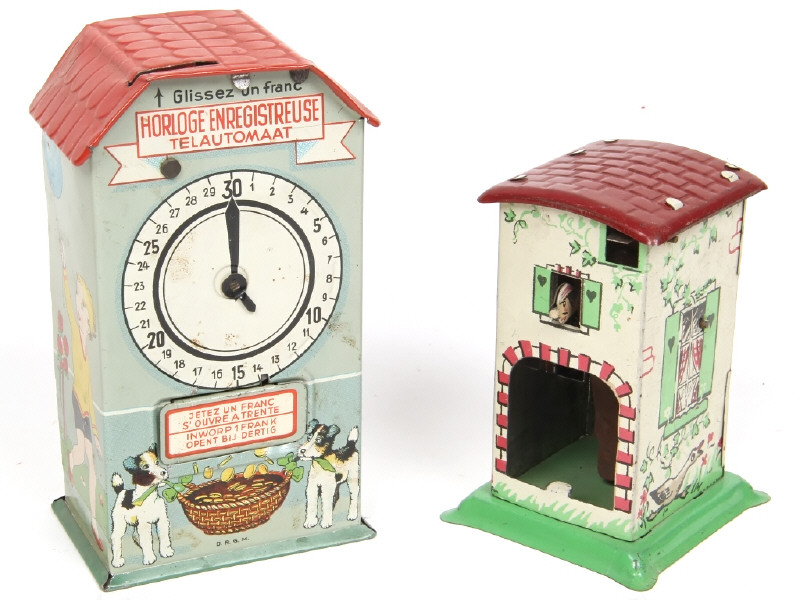 comprend : jouet mécanique avec moteur à clé (à revoir) & tirelire - possibilité de petits manques