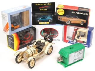 états de 'A' à 'C' - comprend : 4 chariots élévateurs, LOTUS ESPRIT, moteur en plastique & tacot de course - on y retrouve notamment les marques : MARX TOYS, GAMA, BX SERIES & SHELL - on y joint une boite vide de maquette RENAULT FLORIDE