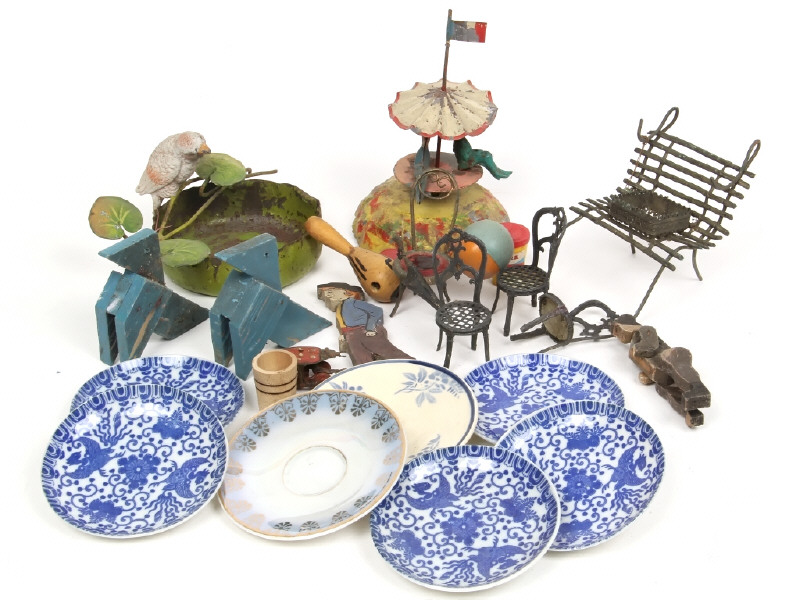 états divers - comprend : 5 assiettes à dînette, personnages en bois, petits jouets en tôle & chaises en métal - avec manques, parties cassées & traces d'oxydation