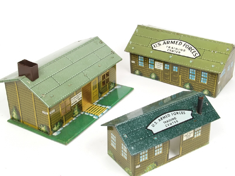 MARX TOYS (USA) Ensemble de 3 bâtiments militaires 'TRAINING CENTER' en tôle lithographiée 2 tons de vert & jaune