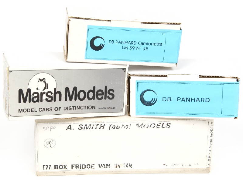 miniatures reproduisant les modèles : DB PANHARD camionette, BOX FRIDGE VAN, COBRA DAYTONA & DB PANHARD - on y retrouve notamment les marques : A.SMITH MODELS & MARSH MODELS - possibilité de petits manques